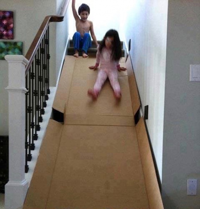 Parce que l’hiver, il fait trop froid et trop humide pour sortir faire du toboggan, les propriétaires d’un escalier vont être ravis ! Grâce à ce jeu, vous n’aurez plus à subir la mauvaise humeur de votre enfant qui veut à tout prix sortir faire du toboggan. Il vous suffit d’un grand carton à poser sur les marches et le tour est joué ! Vous voilà l'inventeur d’un toboggan « maison » qui vous laissera pas mal de minutes de bonheur ! Cela dit, afin d’éviter tout accident, pensez à mettre quelques coussins en bas pour adoucir l’arrivée !