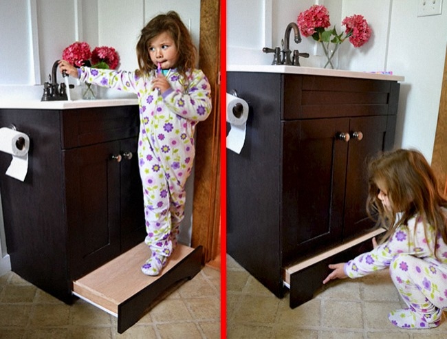 Vous en avez assez d’être « l’esclave » de votre enfant lorsqu’il va se brosser les dents, mais en même temps, vous trouvez que la chaise est un peu dangereuse pour le remonter au niveau du lavabo ? Sacrifiez le tiroir du bas de votre meuble en le retournant pour en faire une plateforme réhaussante.