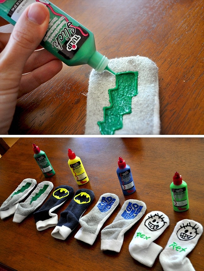 Grâce à de la peinture pour tissus, vous pourrez décorer les chaussettes de vos enfants et les rendre, par la même occasion, antidérapantes ! Vous éviterez les chutes lorsqu’ils marcheront en chaussettes. Petit plus, laissez-les personnaliser leurs paires eux-mêmes s’ils sont en âge, ainsi, ils auront de quoi s'occuper un après-midi pluvieux !
