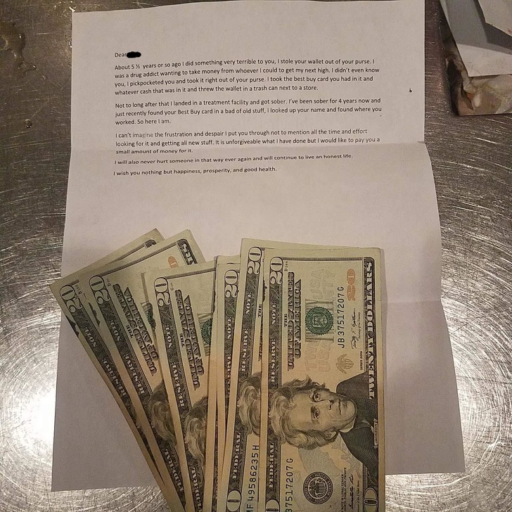Un ex-toxicomane a volé un sac à un étranger il y a 5 ans. Aujourd’hui sobre, il a décidé d’écrire une lettre d’excuses à sa victime en lui remboursant la somme qu’il lui avait prise. Il lui a aussi promis de vivre une vie honnête.