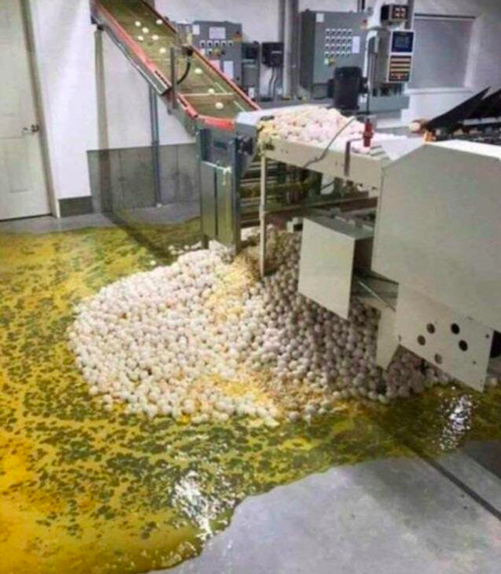 14. Dans cette usine d’œufs, la machine a eu un problème de synchronisation et voici comment les employés ont été accueillis ce matin…