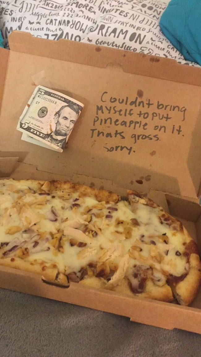 « Je n’ai pas pu me résoudre à mettre de l’ananas là-dedans ! Voici un dédommagement, désolé »