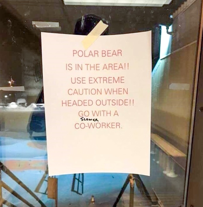 « Un ours polaire vit dans cet espace !! Soyez extrêmement prudent lorsque vous devez sortir, allez-y avec un collègue (lent) »