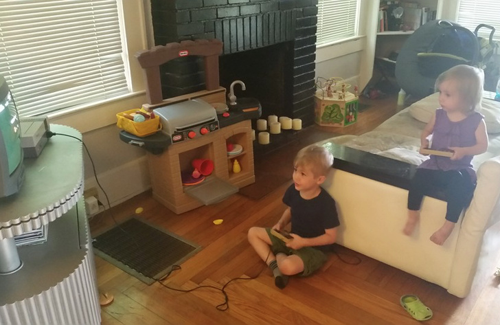 12. Pour jouer en paix, cet enfant a décidé de donner une manette débranchée à sa petite sœur…