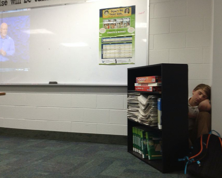 9. L’un des enfants de cette classe en a profité que l’instituteur passe une vidéo sur les finances personnelles, pour aller se cacher derrière la bibliothèque et s’endormir !