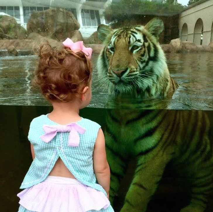 2. Cette petite fille fait un concours de fixation dans les yeux avec ce tigre au zoo