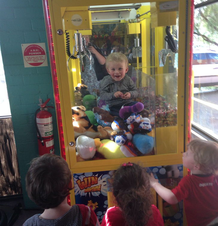 21. Cet enfant est entré dans la machine et a envoyé des bonbons et des peluches aux enfants le temps d’être secouru !