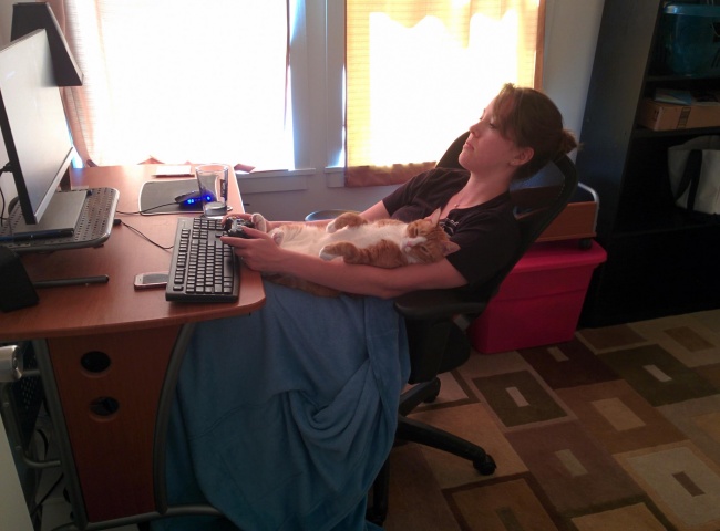 Ici une femme enceinte qui s’exerce à emmailloter son chiot qui semble quelque peu surpris...