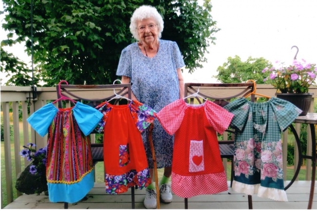 « Cette mamy de 99 ans crée chaque jour une tunique multicolore différente pour envoyer en Afrique à des petites filles qu’elle ne connait pas.»