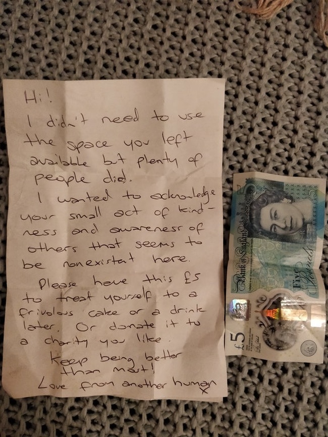 20. Une note reçue (et de l'argent) par un homme après avoir mis un mot sur sa voiture, dehors, disant qu'il risquait d'être bloqué par des rendez-vous