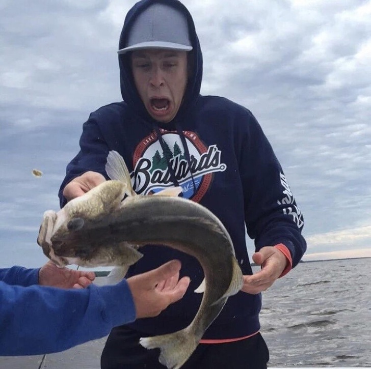 10. Belle prise ! Mais cet homme ne semble pas avoir compris que le poisson était toujours vivant !