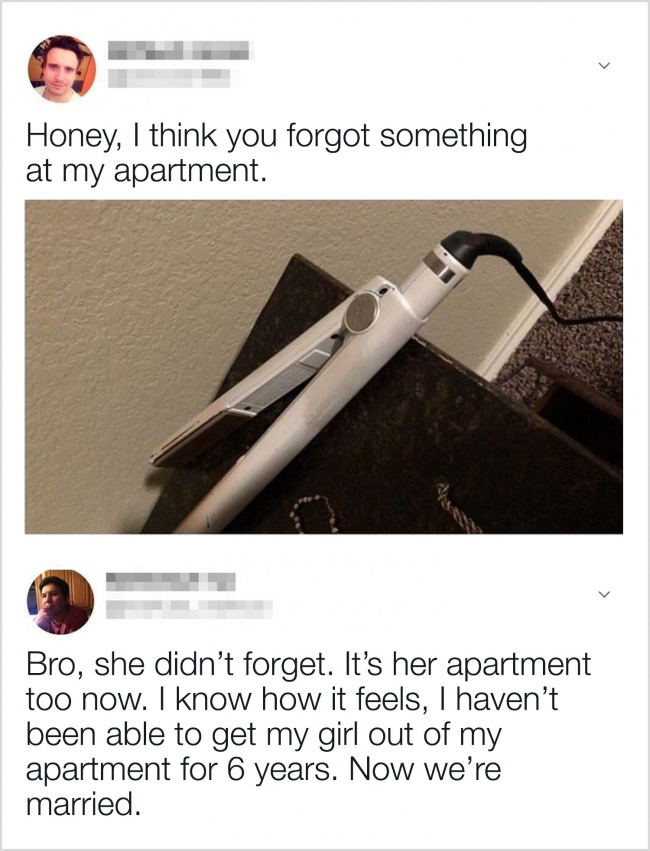 « Chérie, je pense que tu as oublié quelque chose chez moi… » - « Mon gars, elle n’a rien oublié ! C’est son appartement aussi maintenant ! Je sais ce que ça fait… Je n’ai pas réussi à mettre ma copine dehors pendant 6 ans. Maintenant, nous sommes mariés ».