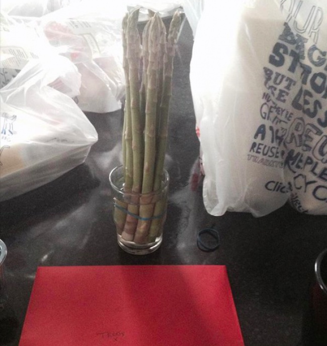3. Elle est restée sans voix devant cette botte d’asperges dans un verre en rentrant du travail. En lisant le petit mot de son homme, elle découvre qu’il a pris les asperges pour des jonquilles !