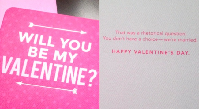 « Veux-tu devenir mon Valentin ? Ceci est une question rhétorique. Tu n’as pas le choix. Nous allons nous marier. Joyeuse Saint-Valentin »