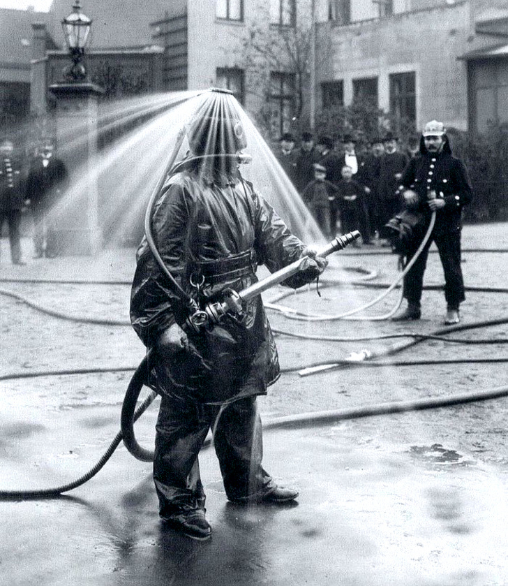 25. En 1900 a lieu la démonstration du casque de pompier de König, avec une douche.
