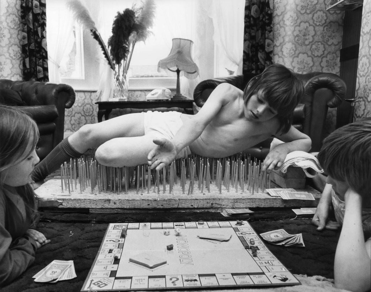 14. Un jeune garçon anglais nommé Mark est allongé sur un lit de clous, alors qu'il joue au Monopoly en 1976.