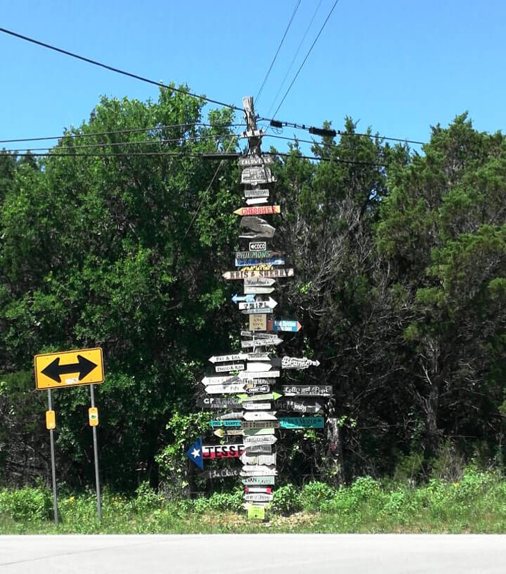 6. Ce panneau d'une petite ville n'indique pas les rues, mais la direction où les gens vivent