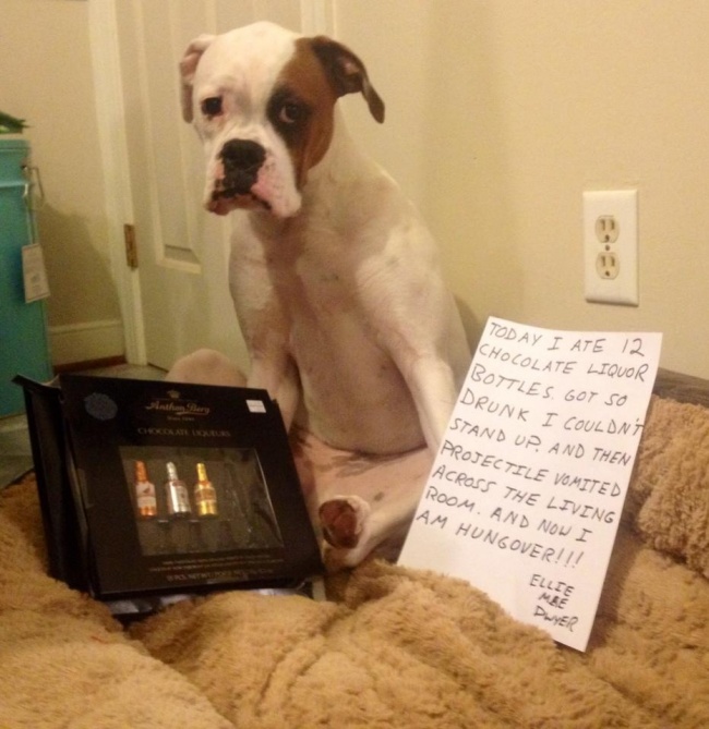 « Aujourd’hui, j’ai mangé 12 bouteilles de liqueur en chocolat. J’étais tellement saoûle que je ne pouvais pas tenir debout, puis j’ai fait un énorme vomi au beau milieu du salon. Maintenant, j’ai la gueule de bois !!! Ellie »