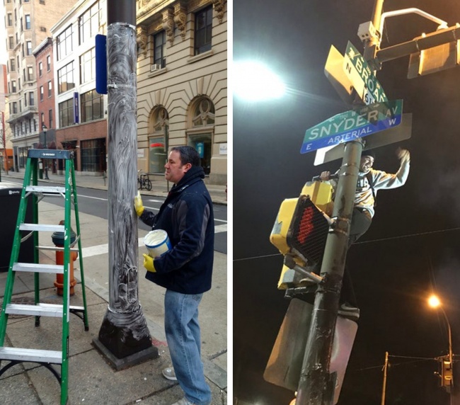 26. La municipalité de Philadelphie a décidé de graisser tous les poteaux de lampadaires, afin d’éviter que les supporters de matches y grimpent. Seulement, ils ont pris cette initiative comme un défi et quasiment tous les lampadaires ont été pris d’assaut pour qu’un champion arrive à s’y hisser !