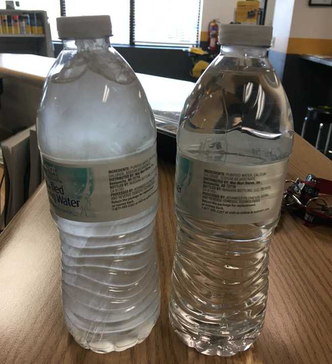 14. Ces deux bouteilles d’eau ont séjourné dans la même voiture la même nuit. L’une d’entre elles a gelé et pas l’autre… Pourquoi ? Vous avez 2 heures…