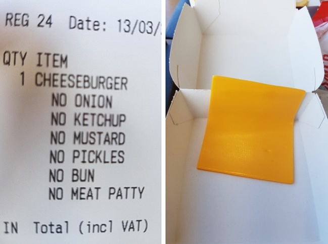 2. Cette personne a demandé un cheeseburger sans oignon, ni ketchup, ni moutarde, ni cornichon, ni pain, ni viande : elle n’a finalement eu que le fromage !