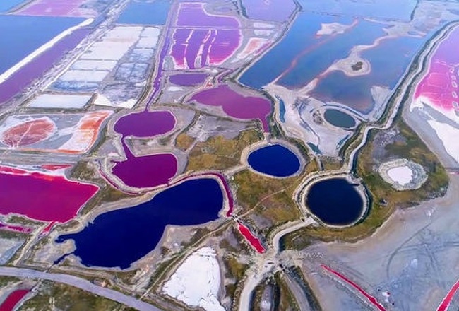 10. En Chine, à cause de la sècheresse, le lac Yuncheng s’est divisé en piscines colorées. Les algues se reproduisant très vite avec la chaleur, elles ont coloré les eaux du violet au rose fluo !