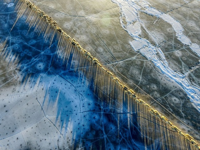 26. Ceci est un troupeau de moutons traversant un lac gelé au Tibet
