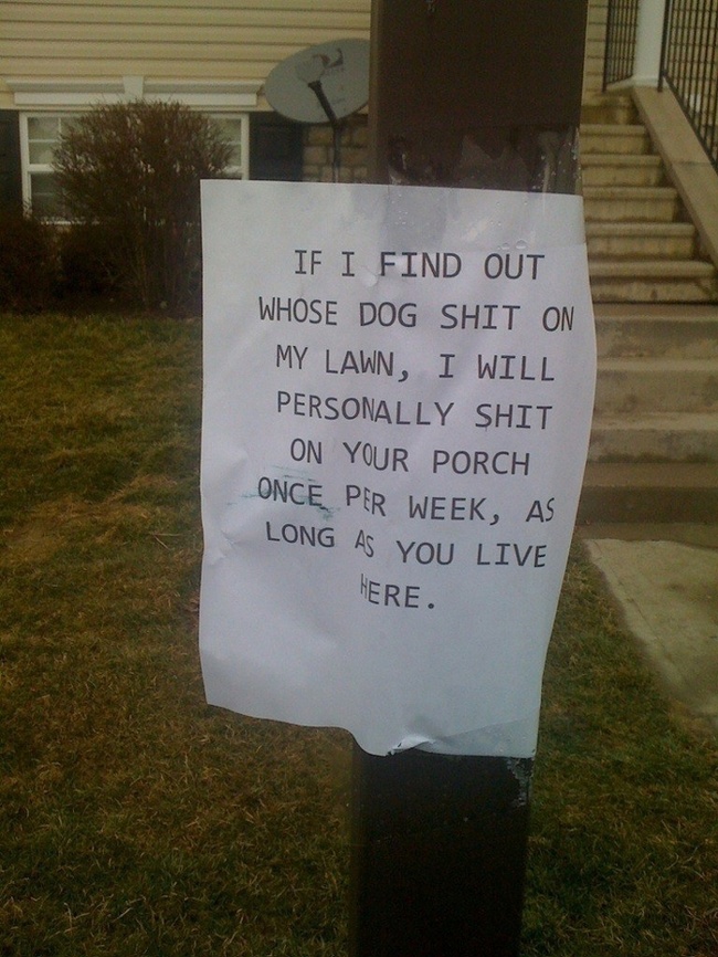 « Si je retrouve celui à qui appartient le chien qui chie sur ma pelouse, j’irai personnellement lui chier sous son porche une fois par semaine, durant tout le temps qu’il vivra ici ! »