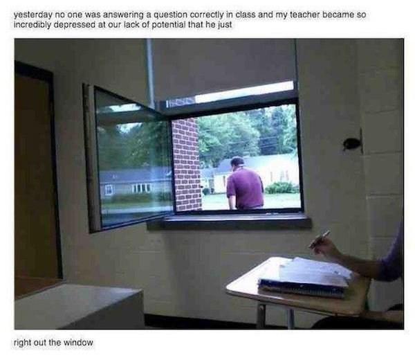 6. Ce prof a posé une question très simple, mais personne n’a su répondre. Dépité, il a quitté la classe par la fenêtre