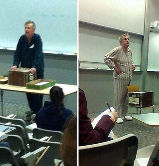 7. Pour protester contre les heures de cours plus tôt le matin, ce professeur a décidé de venir en pyjama et chaussons