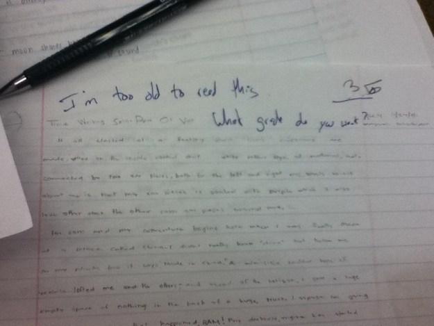 8. Ce professeur est incapable de lire les pattes de mouche de son élève et lui écrit : « Je suis trop vieux pour lire ça, quelle note tu veux ? »