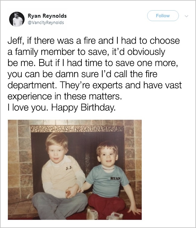 « Jeff, s’il y avait eu un feu et que je devais choisir de sauver un membre de la famille, sans aucun doute ça aurait été moi. Mais, si j’avais le temps d’en sauver un autre, sois vraiment sûr que j’aurais appelé les pompiers. Ce sont des experts et ont une grande expérience dans ce domaine. Je t’aime. Joyeux anniversaire.