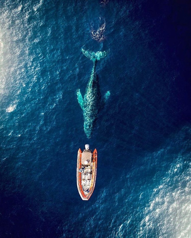 Sur ce bateau voguant au large de la Californie aux États unis, un homme a lancé son drone dans l’espoir d’apercevoir une baleine. C’était sans imaginer une seule seconde qu’une d’entre elles était en train de les suivre ! Ce cliché magnifique laisse également une empreinte indélébile dans les souvenirs de l’équipage.