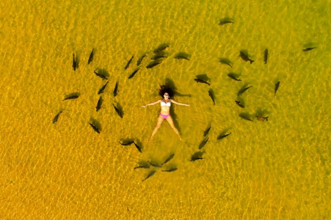 Cette photo a été prise au Brésil, plus précisément à Figueira Beach. Sable doré, mer chaude, la nature environnante est resplendissante et cette femme semble particulièrement sereine au milieu des bébés requins.