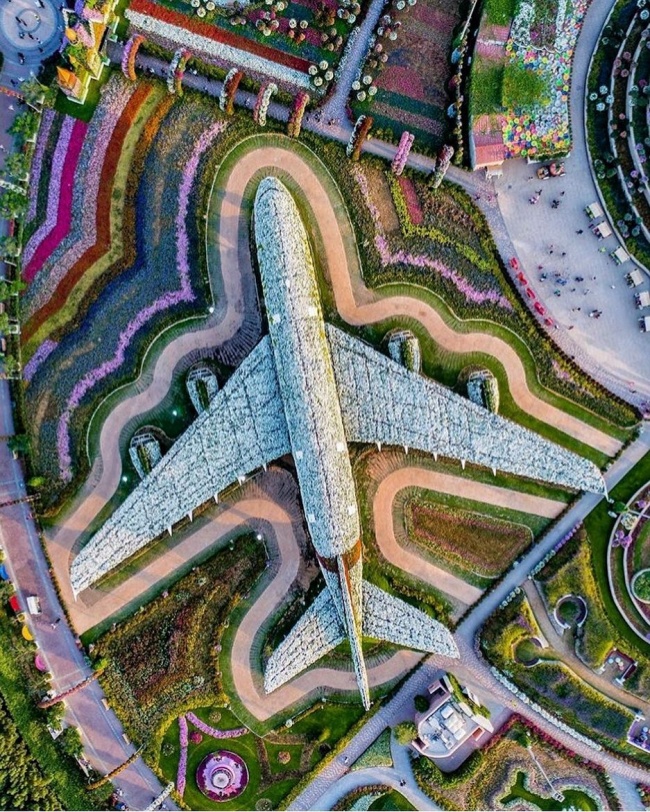 Cette photo illustre toute la richesse des Émirats arabes unis… Il a fallu plus de 5 millions de fleurs et de plantes vivantes pour recréer l’A380 à taille réelle ont été utilisées pour recréer l'avion A380 dans sa taille d'origine à Dubaï.
