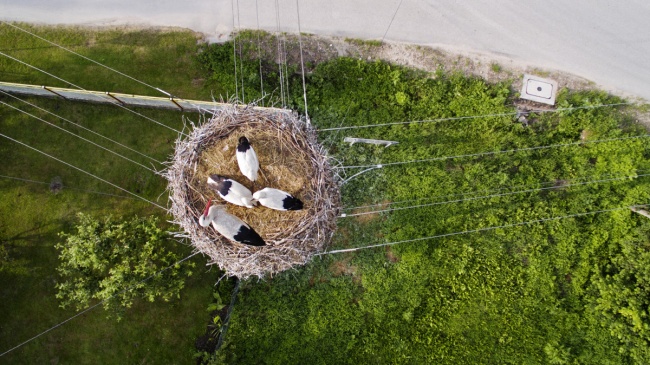 Cette famille de cigogne a élu domicile en haut d’un pylône électrique en Pologne.